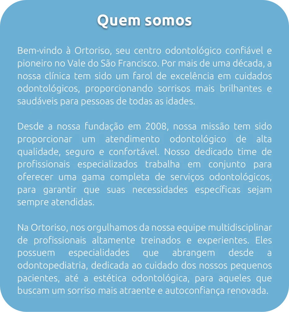 Ser reconhecidos como a clínica odontológica referência no Vale do São Francisco, sendo a primeira escolha quando se trata de cuidados bucais abrangentes e de qualidade. Desejamos ser líderes no campo da odontologia, mantendo-nos atualizados com as últimas tendências e avanços tecnológicos. Buscamos estabelecer relações duradouras com nossos pacientes,